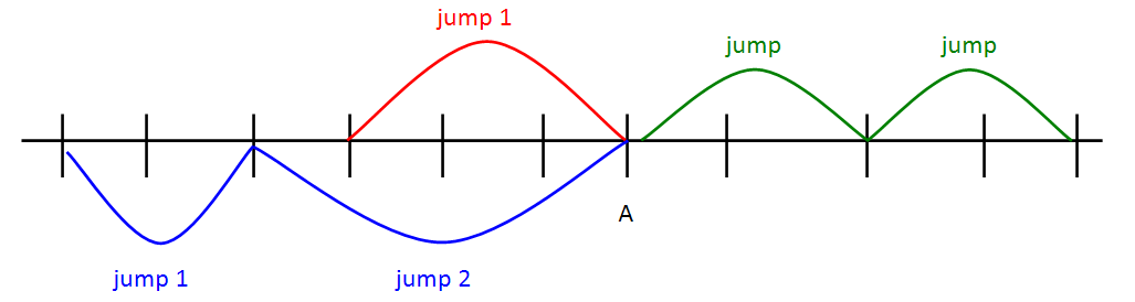파란색과 빨간색은 어느 한 지점에서 만나는데, 파란색은 2번의 점프로, 빨간색은 1번의 점프로 도착했다.